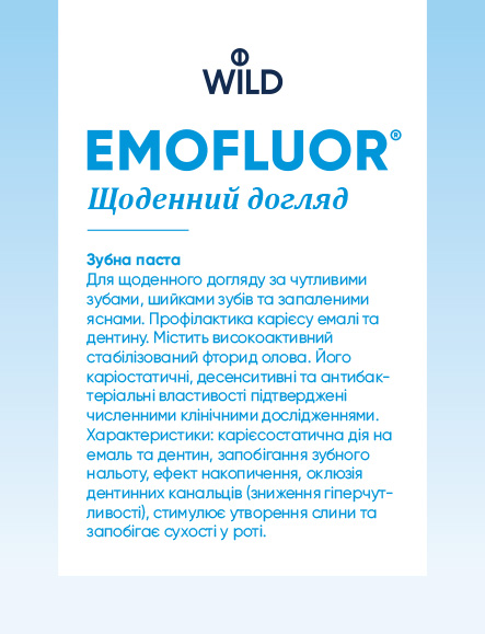 EMOFLUOR® Ежедневный уход Зубная паста содержит высокоактивное, стабилизированное фтористое олово (II) (1000 мг/л F- и 3000 мг/л Sn++), кариостатические (эмаль и дентин), антибактериальные и десенситивные (снижение гиперчувствительности) свойства которого были доказаны различными исследованиями.