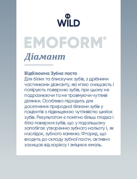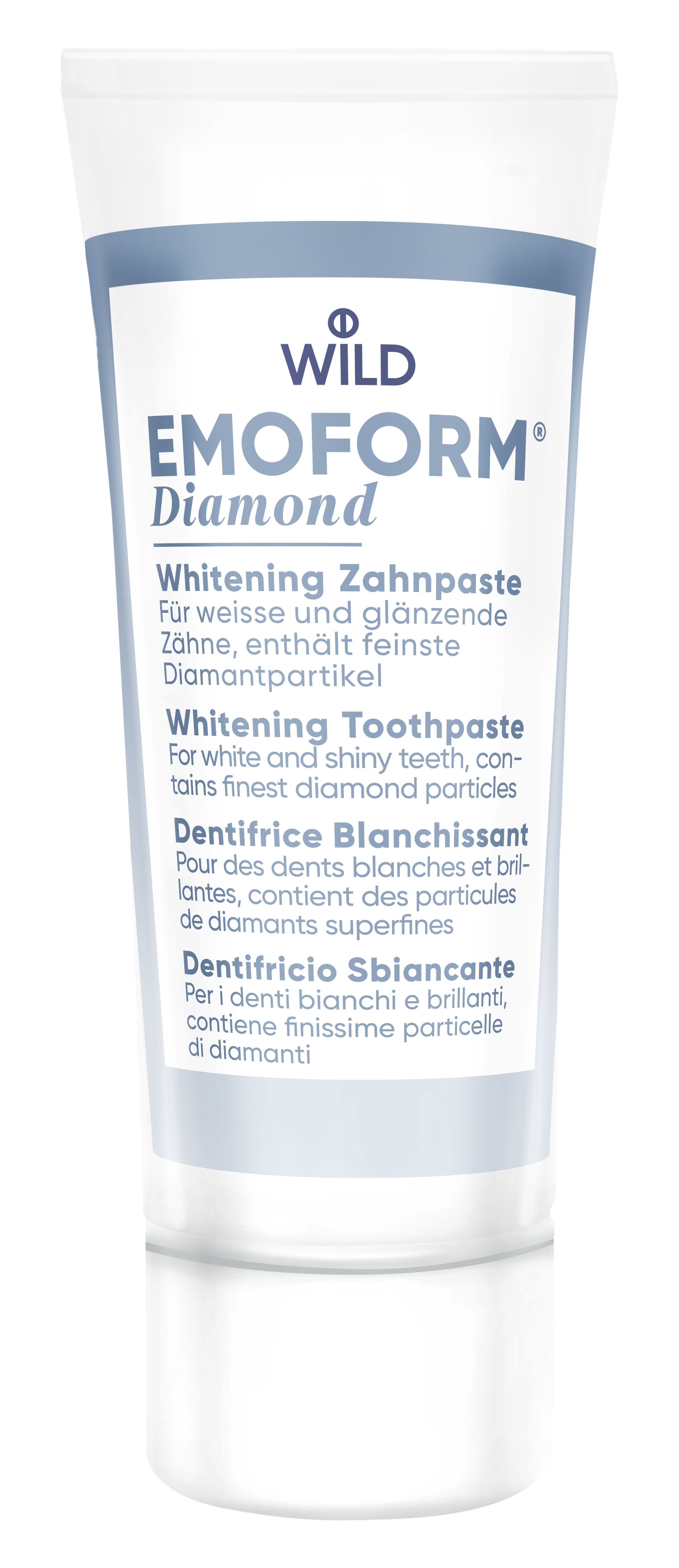 EMOFORM® Диамант Отбеливающая Зубная паста является результатом стоматологических исследований компании Dr. WILD. Она содержит мельчайшие частицы настоящего диаманта, которые мягко очищают и полируют поверхность зубов, при этом не раздражая и не травмируя чувствительные участки. Поэтому EMOFORM® Диамант особенно подходит для достижения естественной белизны зубов у пациентов с повышенной чувствительностью шеек зубов. Результатом является заметно более гладкая и белая поверхность зубов, что в дальнейшем препятствует образованию зубного налета и, как следствие, зубного камня. Фторид, входящий в состав зубной пасты, активно защищает от кариеса и укрепляет эмаль.