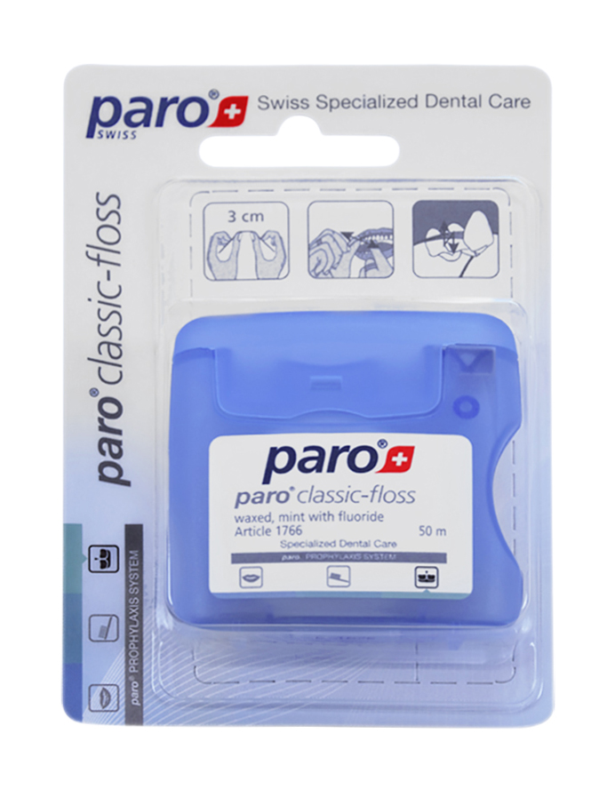 paro® classic-floss это зубная нить, вощеная, с мятой и фторидом. Легко скользит между зубов и очищает даже тесные межзубные промежутки.