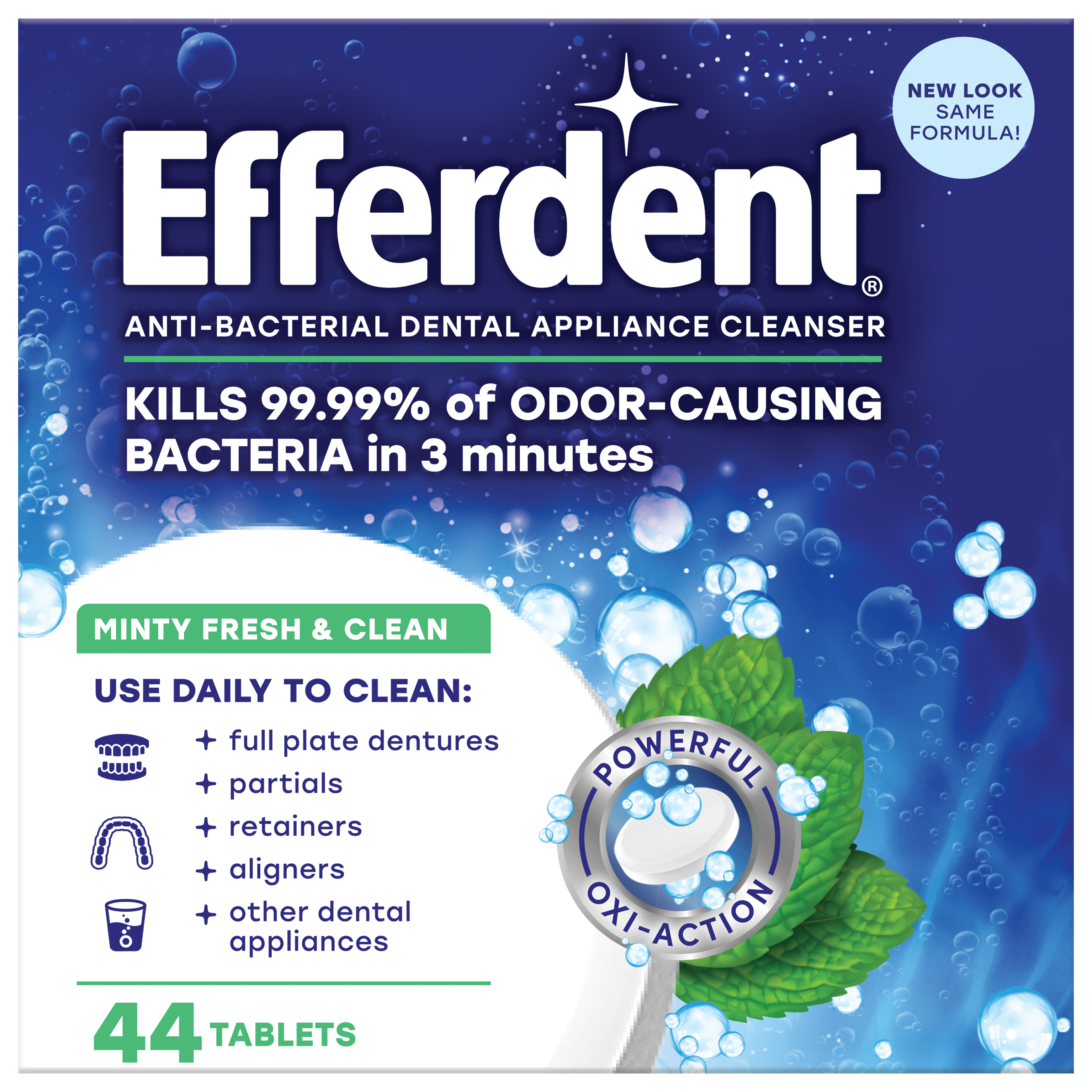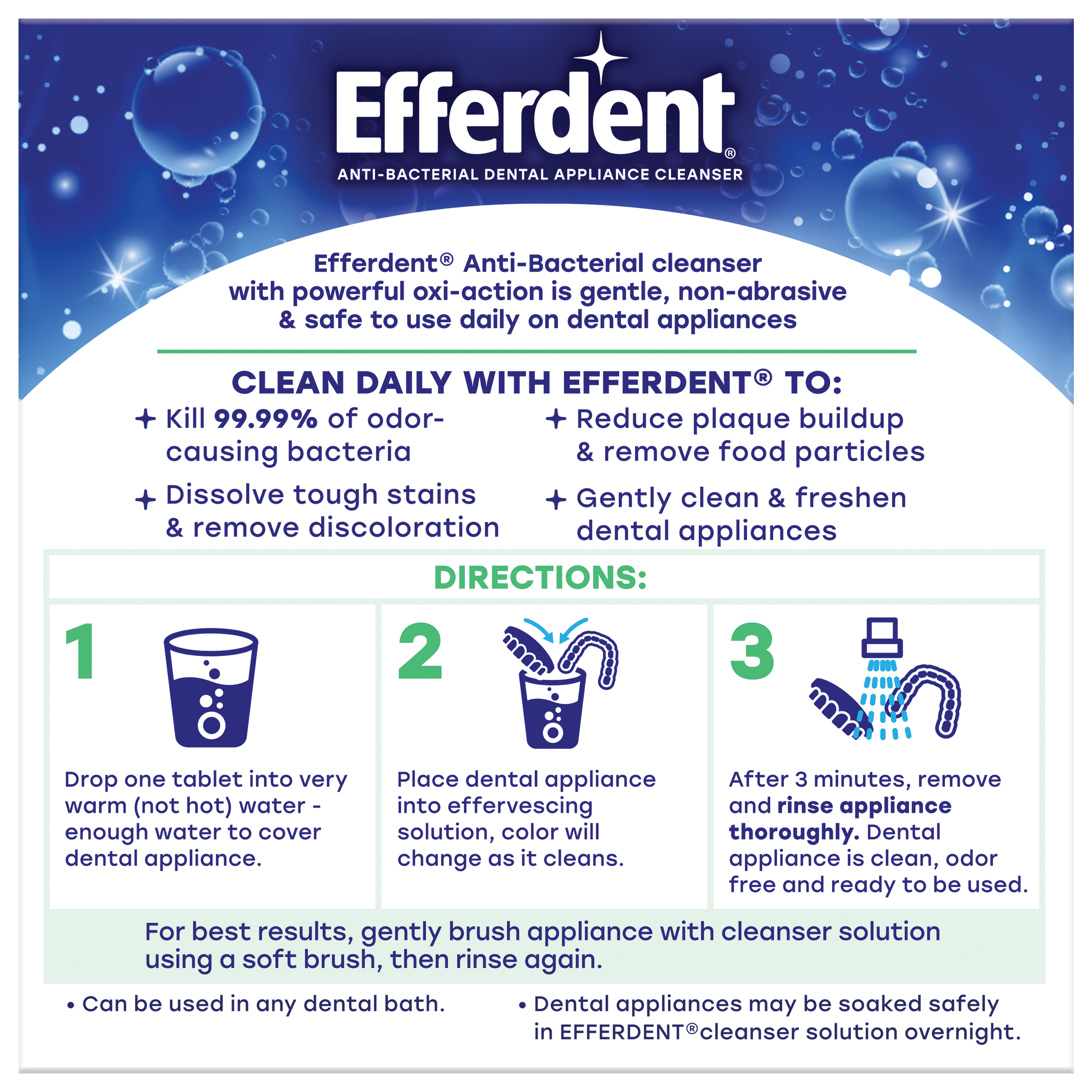 Efferdent М’ятна свіжість та очищення Антибактеріальні таблетки борються з утворенням зубного нальоту та знищують бактерії, що викликають неприємний запах. Лише 3 хвилини — і ваш пластиковий ретейнер або інші стоматологічні конструкції стануть повністю чистими, свіжими та готовими до використання.