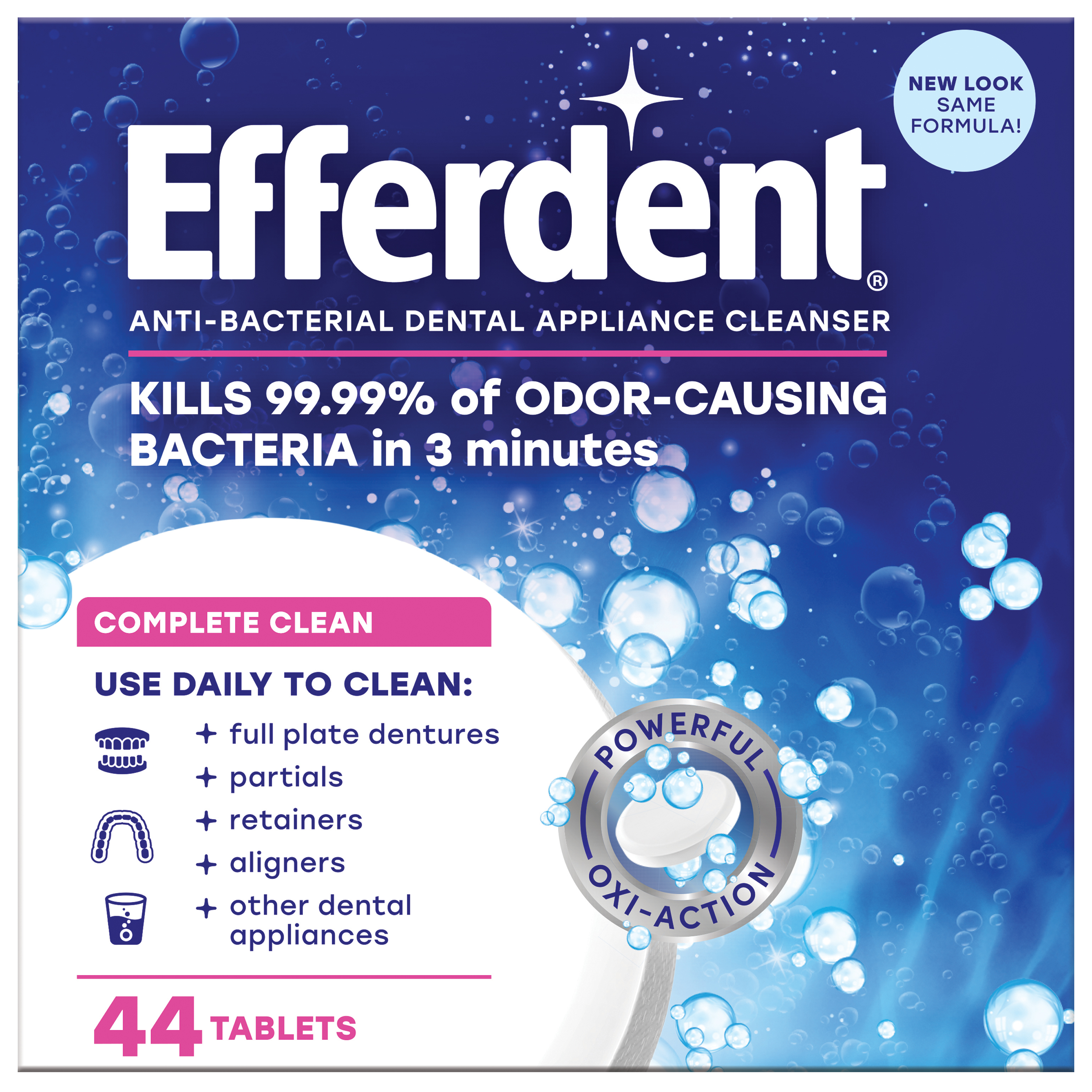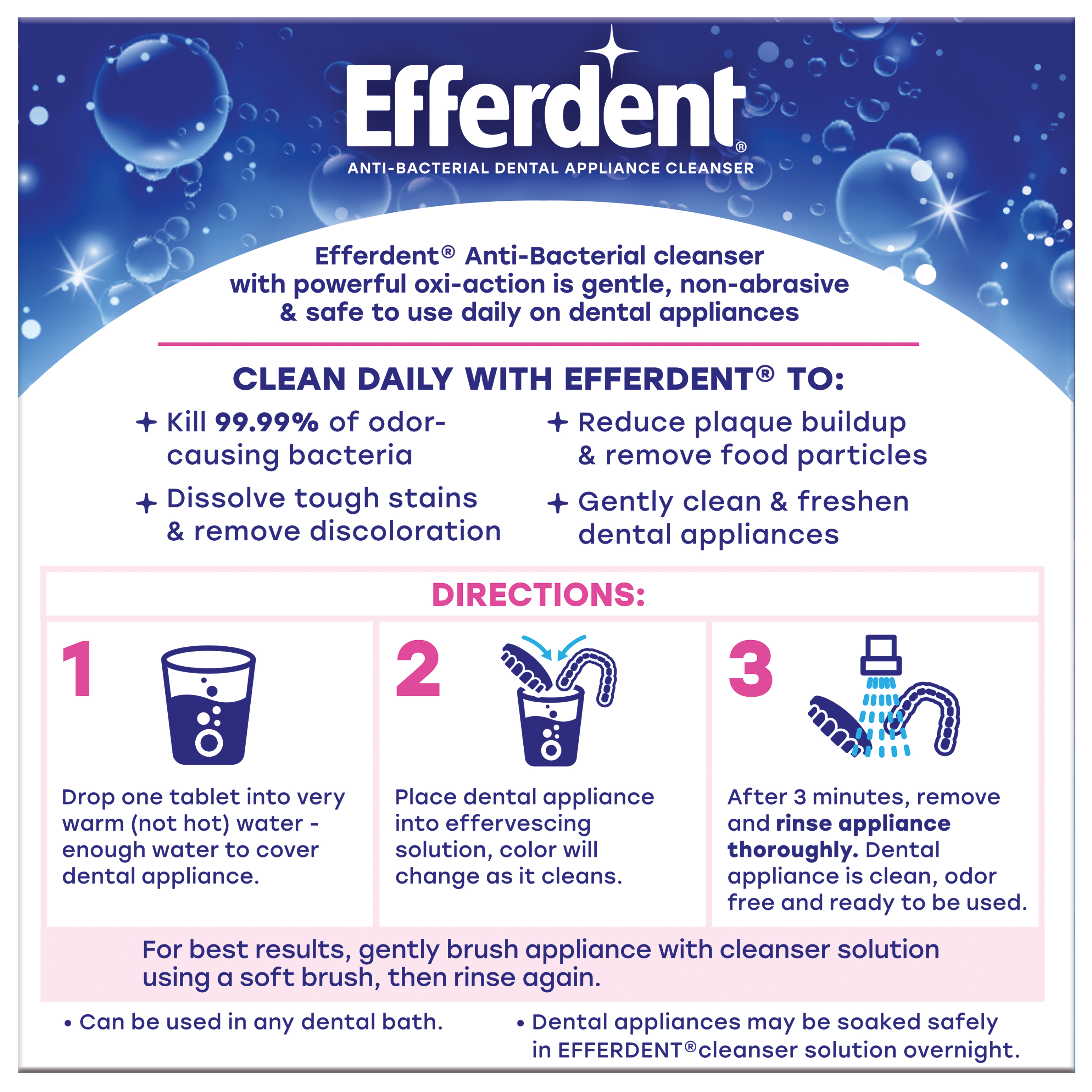Efferdent Повне Очищення Антибактеріальні таблетки борються з утворенням зубного нальоту та знищують бактерії, що викликають неприємний запах. Лише 3 хвилини — і ваш ретейнер або інші стоматологічні конструкції стануть повністю чистими, свіжими та готовими до використання.