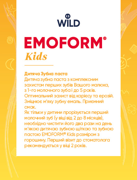Як тільки у дитини прорізується перший зуб (між 2 і 8 місяцем), рекомендується чистити дитині зуби двічі на день зубною пастою actifluor Kids розміром з горошину. Спочатку - з моменту появи першого зуба і поки дитині не виповниться 2 роки - чистку зубів потрібно проводити у формі гри; наприклад, батьки самі можуть чистити дитині зуби подушечкою пальця та зубною пастою EMOFORM® actifluor Kids розміром з горошину. Починаючи з дворічного віку, зуби дитині слід чистити двічі на день спеціальною м'якою дитячою щіткою. Якщо дитина захоче чистити зуби сама, можна дозволити їй зробити це, але батьки повинні знову почистити їй зуби або принаймні проконтролювати як дитина чистить зуби перед сном.