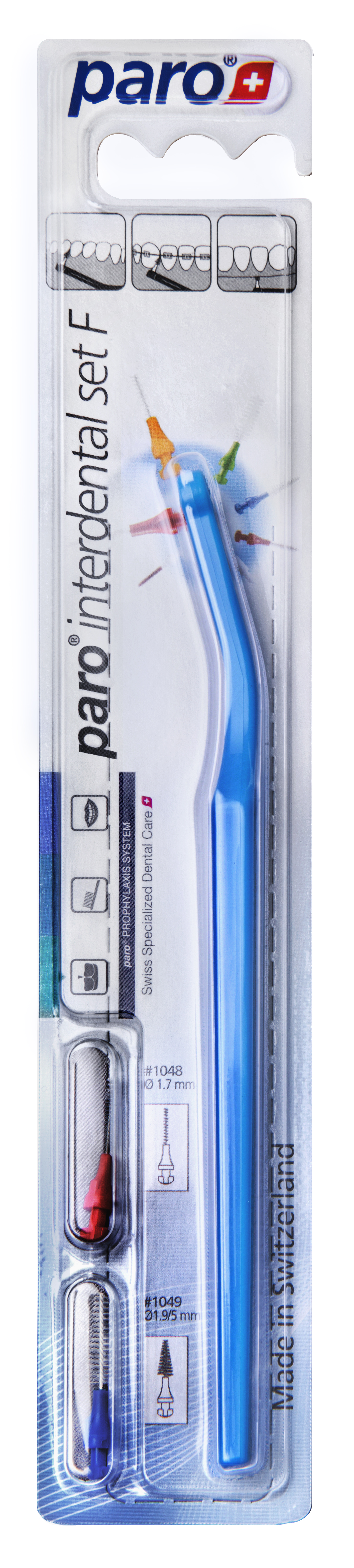 У наборі ергономічний тримач із системою змінних насадок F та щітки для очищення міжзубних проміжків (paro® isola F Ø 1.7 мм та paro® isola F Ø 1.9/5 мм).