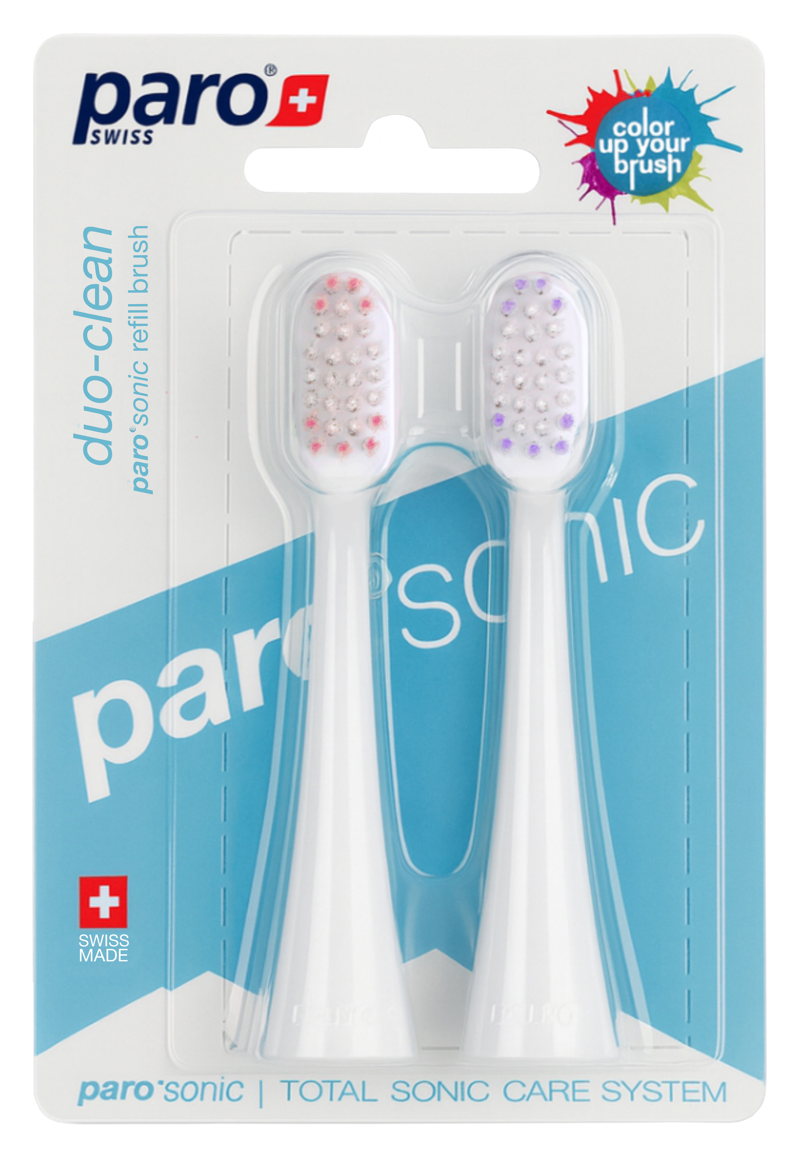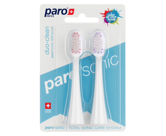 Змінна щіткаparo®sonic duo-clean містить комбінацію конічних, тонко загострених і закруглених щетинок. Топологічне розташування щетинок закругленої форми повторює рельєф поверхні зуба. Це забезпечує більш інтенсивне очищення на глибокому рівні.