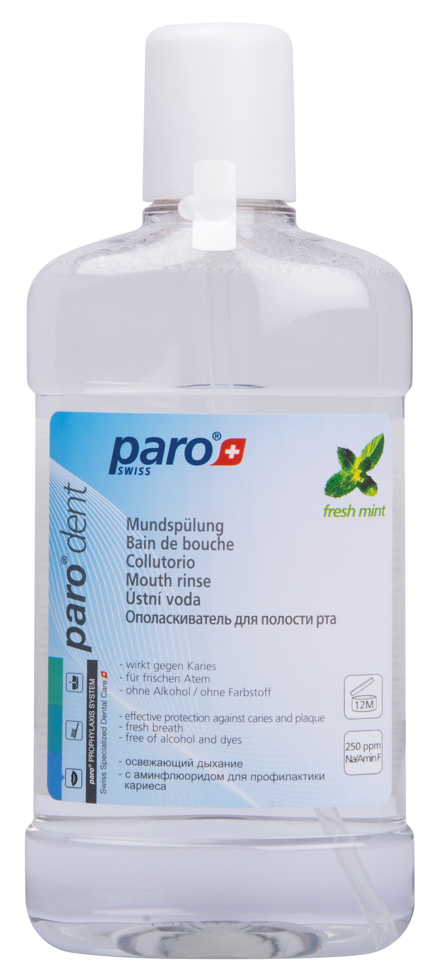paro® dent ополіскувач містить комбінацію амінофториду та фториду натрію. Ці активні інгредієнти запобігають виникненню карієсу, зміцнюють зубну емаль та знижують утворення зубного нальоту. Надовго зберігає свіжість дихання. Не містить спирту та барвників.